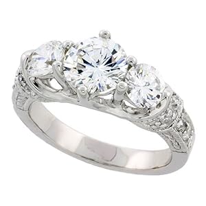 Sterling Silver Vintage Style Three-Stone Engagement Ring w/ Rhodium Plating, w/ two 5mm (.50 Carat each) & one 7mm (1.25 Carats) Brilliant Cut CZ Stones, 3/8" (9mm) wide, size R Massive saving, Order Now! It is truly an amazing For Sale Sterling Silver Vintage Style Three-Stone Engagement Ring w/ Rhodium Plating, w/ two 5mm (.50 Carat each) & one 7mm (1.25 Carats) Brilliant Cut CZ Stones, 3/8" (9mm) wide, size R. I highly recommend For Sale this product for anyone. I absolutly love it!